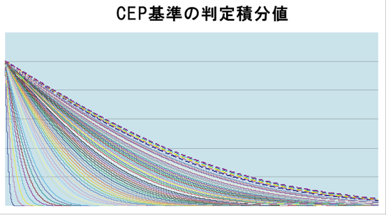 CEP(半数必中界)から精度係数を求め、積分していくと、横のグラフ図のようになります。