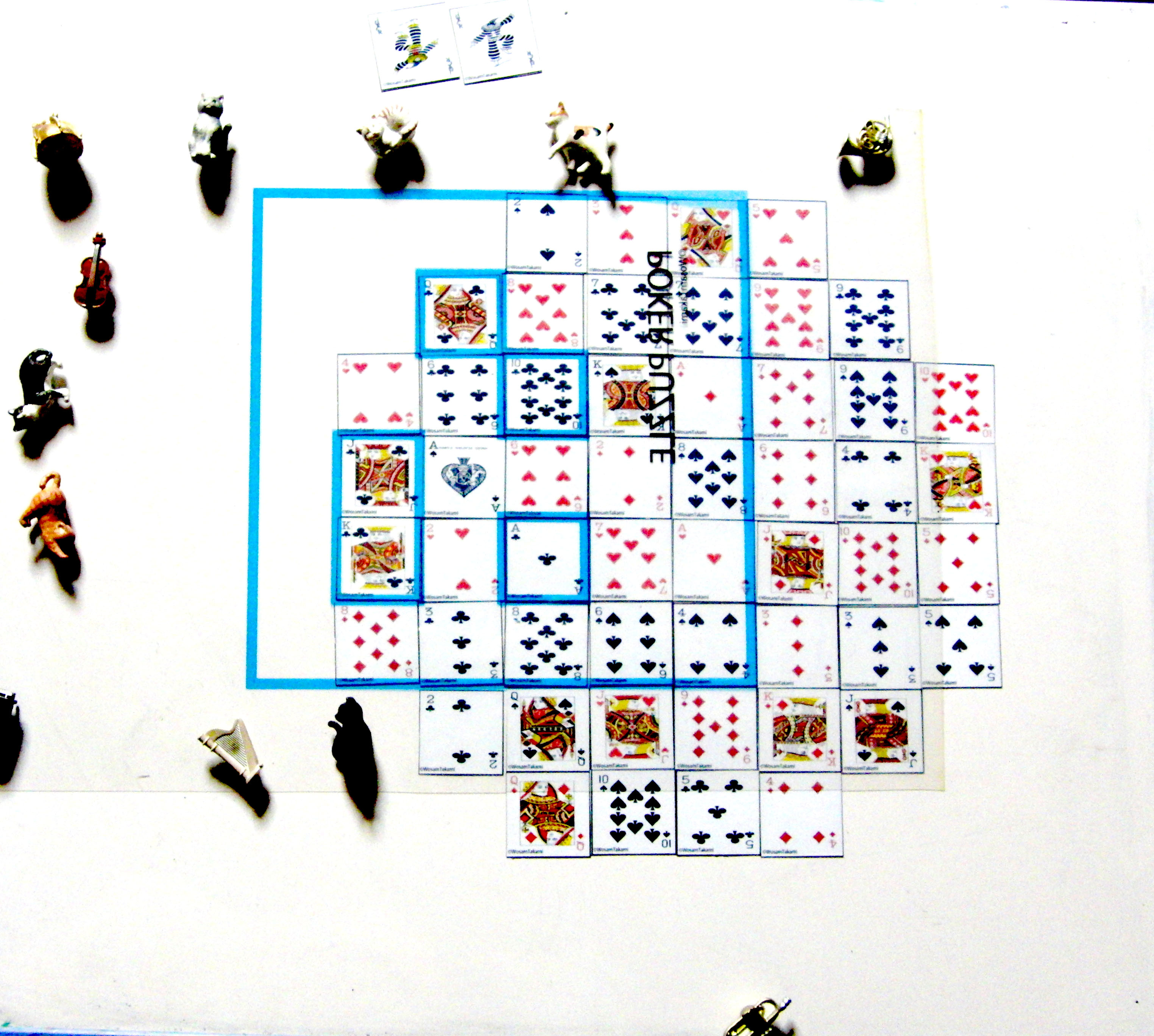 ルールは、ジョーカーを除いた四種類のスーツの正方形コマ、A、2、3,~Q、Kの52枚を上図のように四隅の角を3駒ずつ除いた13×4=52枚を8×8-3×4=64-12=52枚として配置して、出題しあい時間制限などを付けて出します。あらかじめ最高位の役を決めて出題することが出来ます。空白のマスが生じる役は認めません。